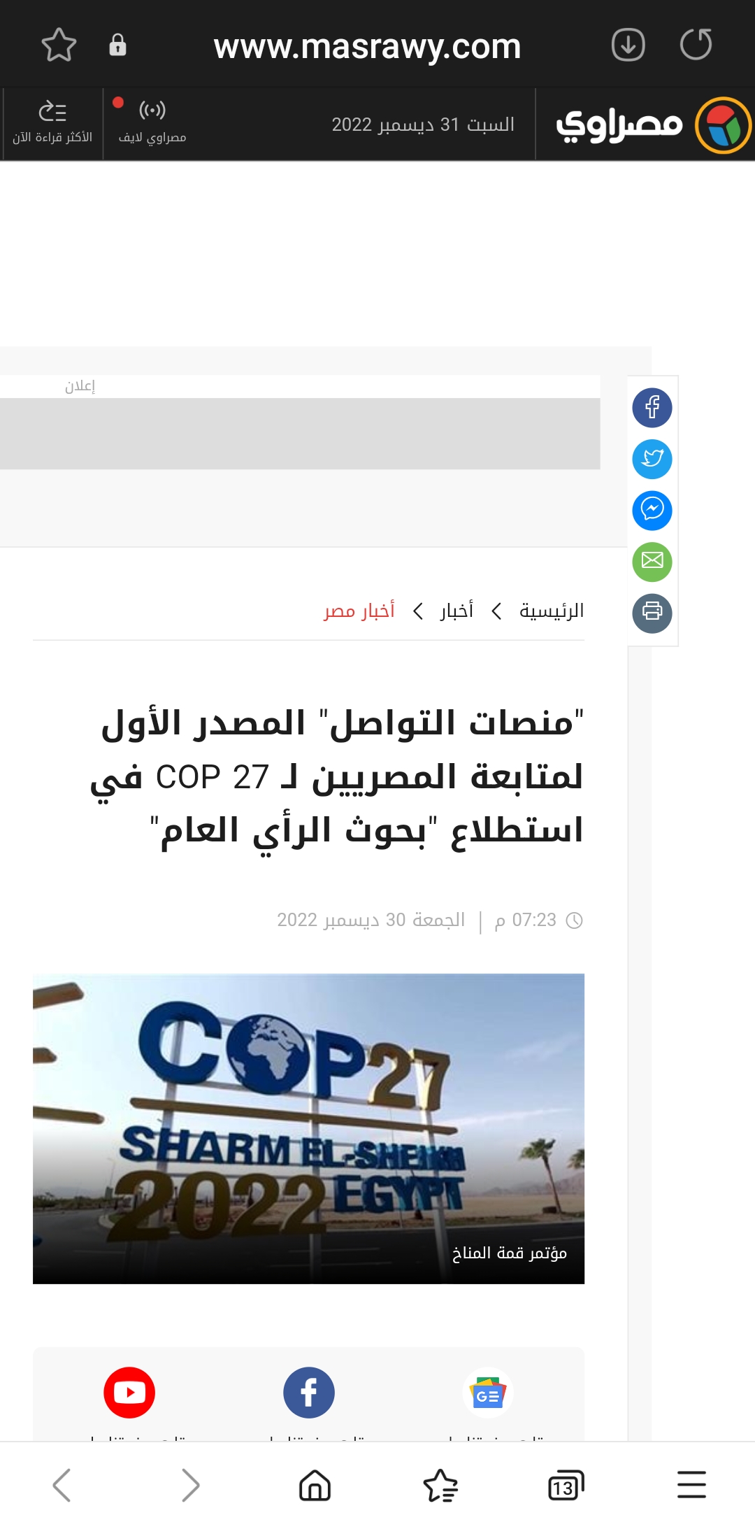 The Public Opinion Research Center at the Faculty of Mass Communication, Cairo University, conducted an opinion poll aimed at monitoring the role of the Egyptian media in providing the Egyptian public with information and news about the Climate Summit in Egypt COP 27